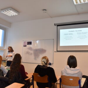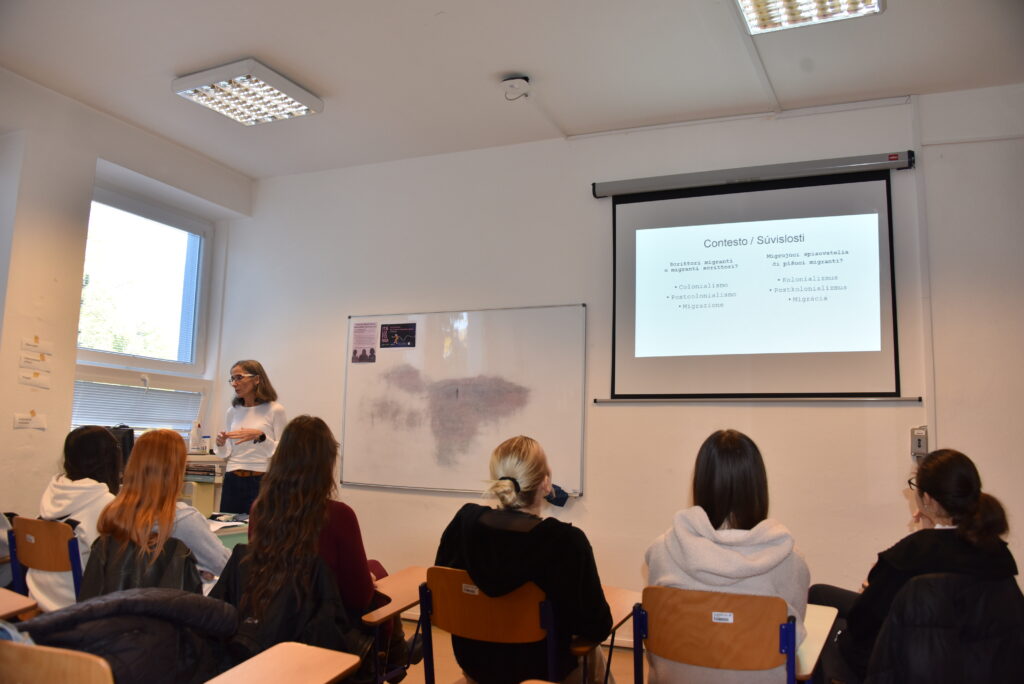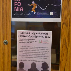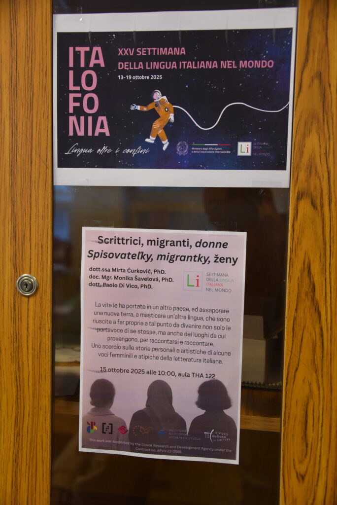 Pri tejto príležitosti sa niektorí taliančinári z Katedry romanistiky a germanistiky a z Katedry translatológie Univerzity Konštantína Filozofa v Nitre spojili, aby študentom i verejnosti priniesli dve zaujímavé a podnetné podujatia s jednotiacou témou, ktorou bola italofónia. Cieľom 25. ročníka totiž bolo osláviť jazykový, kultúrny a spoločenský priestor taliančiny a zároveň si predstaviť novú komunitu ľudí z celého sveta, ktorých spája vášeň pre taliansky jazyk a prostredníctvom neho aj blízkosť k Taliansku. Ako súvisí migrantská literatúra s postkolonializmom? Aké sú rozdiely medzi prisťahovaleckou a postkoloniálnou literatúrou? Aké sú témy, ktorými sa migrant writers charakterizujú? Aké sú špecifiká ženskej spisby, ktorá vzniká zo skúsenosti migrácie? Čo sa autori a autorky snažia docieliť a čo im a čitateľskej obci táto tvorba prináša? To sú len niektoré z otázok, na ktoré sa dňa 15. októbra 2025 na pôde Filozofickej fakulty zvedavým poslucháčom – študentom snažili odpovedať docentka Monika Šavelová (KTR) a doktorka Mirta Ćurković (KRG) v spolupráci s doktorom Paolom Di Vicom (KRG) v prednáške Spisovateľky, migrantky, ženy (Scrittrici, migranti, donne). Prednášajúci sa zamerali na špecifický fenomén slovenských spisovateliek žijúcich v Taliansku, využívajúcich jazyk polostrova ako svoj vlastný vyjadrovací prostriedok. Predstavili príslušníčky rôznych generácií, ako sú Jarmila Očkayová, Michaela Šebőková Vannini či Jana Karšaiová, ktoré vyviezli z rodiska do talianskej literatúry a kultúry témy spojené s ich domovinou. Zároveň však odznela často tematizovaná túžba autoriek vytvoriť si v hosťovskej krajine nový životný a umelecký priestor a opätovne sceliť svoju členitú identitu.