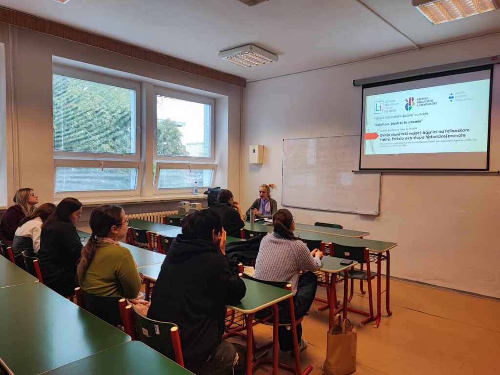 O deň neskôr, 16. októbra 2025, odznela prednáška pre širšie publikum, ktorú viedla docentka Natália Rusnáková. Témou boli Dvaja slovenskí vojaci – básnici na talianskom fronte. Poézia ako stopa historickej pamäte. Prednášajúca na materiáli vybraných básní dvoch slovenských básnikov Jána Smreka a Štefana Žáryho, tvoriacich (aj) v období 40. rokov 20. storočia, zvýraznila vzťah medzi inšpiráciou talianskym koloritom, osobnou skúsenosťou s talianskym prostredím a recepciou tých hodnôt modernej talianskej poézie, ktoré sa aktualizovali práve v danom historickom okamihu v časopriestore zázemia, mieru, ale aj frontovej línie tzv. južného frontu. Interpretačne sa Rusnáková venovala najmä talianskej frazematike prítomnej vo vybraných básňach a použitiu emblematických toponým a názvov kultúrnych reálií, ktoré v predmetných textoch fungovali ako metonymické znaky zastupujúce celú taliansku realitu a jej vnímanie slovenskými čitateľmi.